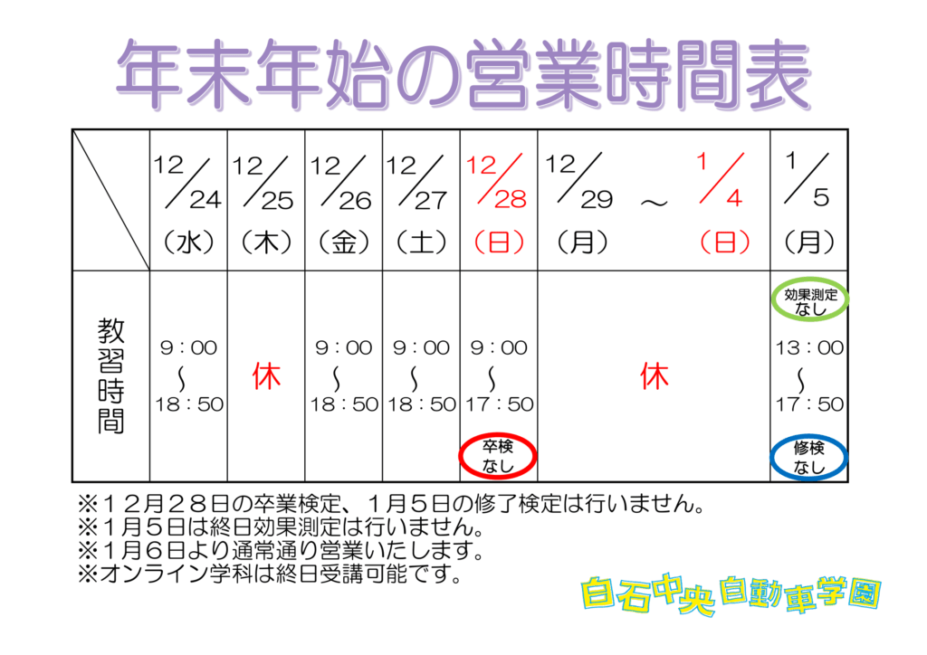 また、営業開始は1月5日(土)からとなりますが、教習時間は13:00~17:50となります。